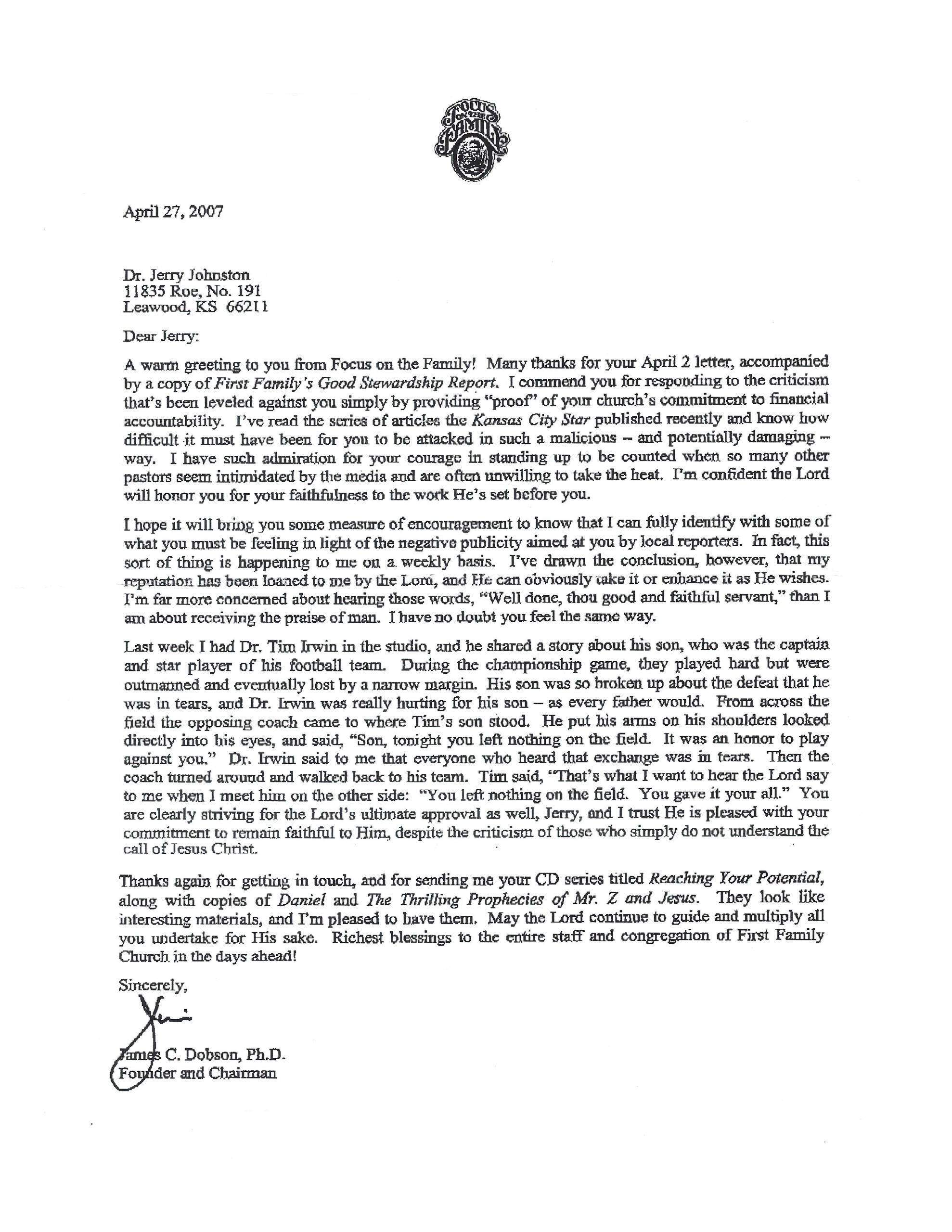 - Johnston championed the Kansas Marriage Amendment at the request of Pastor Joe Wright of Central Christian Church in Wichita, Kansas, and incurred the retaliation of repeated attacks by the Kansas City Star, which dispatched a full-time investigative journalist on him, his family, and printed numerous libelous stories which launched an investigation by the Kansas Department of Consumer Protection, and two years of immense stress and trial. Dr. Jay Sekulow, president of the American Center of Law & Justice, led a team of lawyers at the request of the Board of Elders of First Family Church. The team was led by board chairman, the Honorable Judge Robert Ulrich (former United States District Attorney/Western Missouri District); Dr. Johnston and the church were fully exonerate. Dr. Jay Sekulow stated in October of 2009 in a live telecast service at First Family Church that he had never witnessed a more politically motivated witch hunt in his 30 years of practicing law and defending Christian freedom in the United States. For a complete description and associated appendices, please read chapter one of Dr. Johnston’s doctoral dissertation: http://scholar.acadiau.ca
